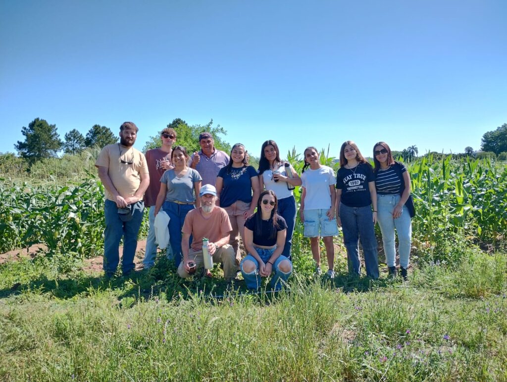 La visita, impulsada por la cátedra «Introducción a la Agroecología y la Agricultura Familiar» de la Licenciatura en Administración Rural, llevó a las y los estudiantes de primer año de la carrera hasta La Ponderosa, el emprendimiento familiar de Horacio Dri, en Benito Legerén. El productor orientó su campaña hacia maíz dulce, batata, zapallo anco, cabutiá y tronco, bajo un esquema de manejo sustentado en la rotación de cultivos, el descanso de los lotes y una administración responsable de los recursos.