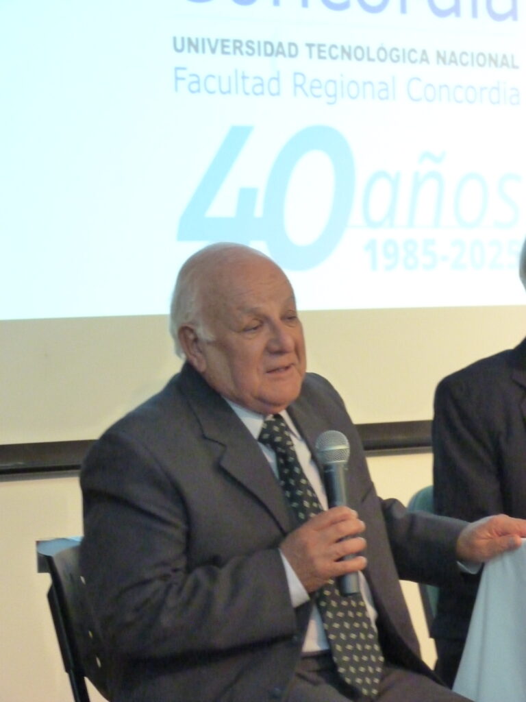El Ing. Carlos Cruz Leiva, como graduado de la UTN, comentó «en primer lugar, quiero hacer un agradecimiento fundamental que involucra, prácticamente, y y tal vez casi exclusivamente, al grupo de pioneros, y más que al grupo de pioneros, a sus respectivas familias. ¿Por qué? Porque ese grupo de pioneros que te ven, a veces veníamos los fines de semana a construir muchas de las cosas que ustedes ven construido ahí Dejábamos los fines de semana nuestra familia, y entonces veníamos a construir, a veces acompañado por nuestros propios hijos. Que venían a a fabricar bloques de cemento y ayudarnos a acarrear agua para levantar paredes». Fue una hermosa experiencia, una hermosa, este, pero, fundamentalmente, debo reconocer que, si nuestras familias no nos hubieran aguantado en aquel momento, no digo que esto no se hubiera, pero más de uno de nosotros no hubiera estado participando. «. Luego finalizó diciendo «Orgullo siento de estar hoy acá cuando se cumplen 40 años y más que nada más que el orgullo, la alegría profunda de ver que seguimos a través de los 40 años seguimos generando profesionales con principios, con valores».