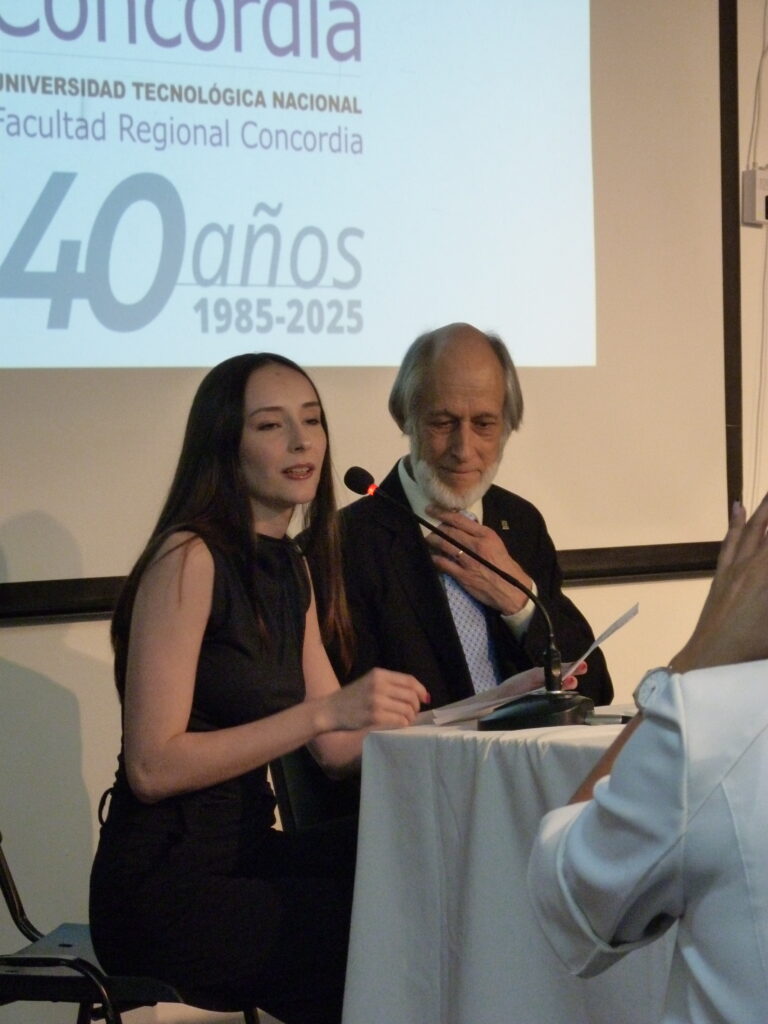 La estudiante Dolores Simón, expresó en una parte de sus palabras «Ser UTN es aprender que acá no solo se forman profesionales, también se construyen personas, nos moldea el carácter, nos enseña a pensar con la cabeza. En esta Facultad aprendimos a sostenernos unos a otros, a entender que cuando un compañero logra algo, de alguna forma lo logramos todos. Aprendimos que el conocimiento tiene sentido cuando se comparte, cuando vuelve a la sociedad convertida en soluciones, en esperanza, en futuro». Luego dijo «Cuarenta años, cuarenta años de aulas que vieron personas crecer, de pizarrones que guardan ecuaciones y también sueños, de pasillos que escucharon silencio de cansancio, pero también risas. Cuarenta años de una Facultad que no se mide en metros cuadrados, sino en historias, en los primeros que creyeron, en los que sostienen cada día este lugar con compromiso, y en nosotros, los que seguimos construyendo su futuro paso a paso».